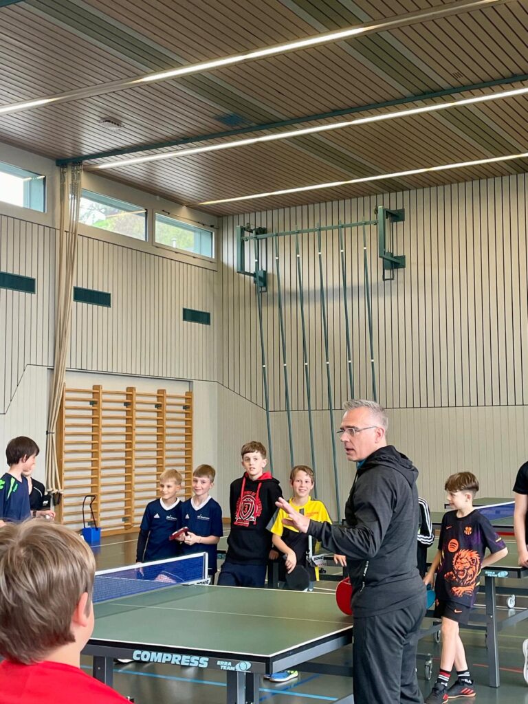 Danach wurde es etwas „ernster“, zumindest kurz: Verschiedene Schlagtechniken, Aufschläge und die Zählweise wurden erklärt und direkt geübt. Lange Theorie gab es aber nicht – das Gelernte wurde gleich in einem kleinen Turnier ausprobiert. Dabei gab es viele spannende Ballwechsel und einige überraschende Talente zu entdecken.